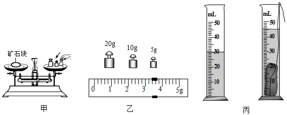 (2)用调好的天平测石子的质量,小明用天平测量矿石块的质量,如图甲,指出实验操作中的错误:。改正错误后,小明用正确的方法称矿石块的质量,平衡时放在盘中的砝码和游码在标尺上的位置如图乙,则石头的质量为 g,在量筒内装有一定量的水,该石子放入前、后的情况如图丙所示,则石头的体积是 cm3,此石头的密度是 kg/m3。
