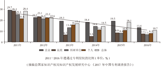 B.2015年企业和高校遭遇侵权的比例较之以往四年有所提高,总体侵权比例也略有反弹;而2016年各项侵权比例均呈下降态势,总体遭遇侵权比例为10.7%。