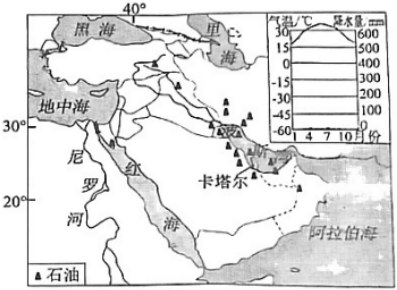11.卡塔尔是个高收入国家。卡塔尔政府规划,到2022年国内新鲜果蔬自给率将从2019年的22%增加到70%。如图示意西亚部分区域和卡塔尔气候资料。读图完成11~14题。