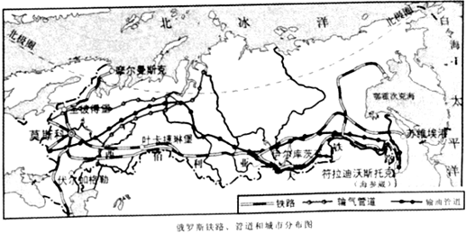 24.看电影也能学地理,跟着《囧妈》一起游俄罗斯。读“俄罗斯铁路管道和城市分布图”,完成8~10题。
