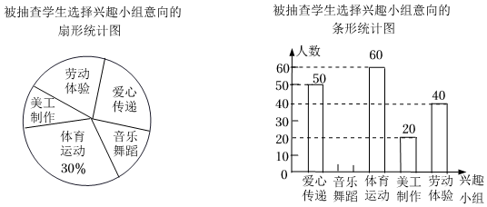 22.为落实“双减”政策,切实减轻学生学业负担,丰富学生课余生活,某校积极开展“五育并举”课外兴趣小组活动,计划成立“爱心传递”、“音乐舞蹈”、“体育运动”、“美工制作”和“劳动体验”五个兴趣小组,要求每位学生都只选其中一个小组.为此,随机抽查了本校各年级部分学生选择兴趣小组的意向,并将抽查结果绘制成如下统计图(不完整).