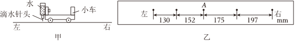 13.某同学用自制的“滴水计时器”来研究小车在水平桌面上运动时受到的阻力大小。如图甲所示,将该计时器固定在小车旁,用手轻推一下小车,在小车的运动过程中滴水计时器间隔相等时间滴下小水滴。图乙记录了桌面上连续5个水滴的位置,已知滴水计时器每10s滴下25个小水滴,小车的总质量为2.4kg。