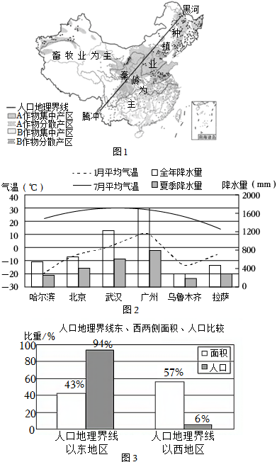 26.农业在中国历来被认为是安天下、稳民心的战略产业。我国幅员辽阔,农业生产存在着明显的地域差异。如图1为我国两种主要粮食作物分布图,图2为我国几个城市气候资料图,图3为人口统计图,回答下列问题。