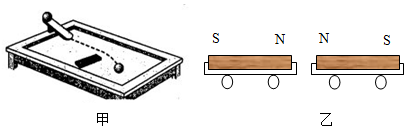 甲图中,小铁球从斜面上滚下沿直线运动,当经过磁铁附近时方向发生了改变,此现象说明力可以改变物体的运动状态改变物体的运动状态;乙图中,放有磁铁的两个小车用细线相连,剪断细线后,小车向相反的方向运动,此现象说明物体间力的作用是相互相互的。