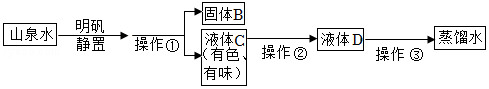 今年国庆假期,小明从旅游地带回一瓶浑浊的山泉水,他在化学实验室模拟自来水厂的净水过程,最终制成蒸馏水,制取流程如图所示: