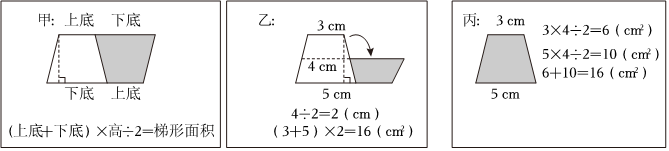 学完平行四边形和三角形的面积计算方法后,三位同学尝试解决求梯形面积的问题,有以下3种想法,( )的想法对。