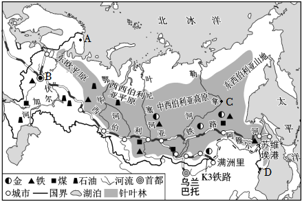 (1)图中ABCD四个城市中,能见到“极昼极夜”现象的是,俄罗斯大部分地区冬季漫长寒冷,主要原因是。