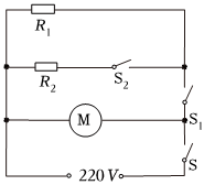 如图甲是某品牌家用电吹风,其电路如图所示,R1、R2为电阻丝,M为电动机。通过调节开关,可使电吹风分别处于“停止”“冷风”“暖风”或“热风”四种状态。已知该电吹风的额定电压为220V,吹冷风时电吹风额定功率是110W,R1=110Ω,R2=55Ω,吹热风时电吹风额定功率是1430W,求: