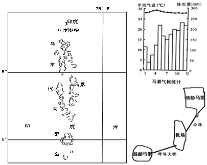 马尔代夫是印度洋上1200余个小珊瑚岛屿组成的岛国。岛屿地势低平,平均海拔1.2米。住人的有200个,其中又以马累岛、机场岛和胡鲁马累岛为主要居住岛。此前,机场岛到胡鲁马累岛有一条公路相连,但马累岛到机场岛需要摆渡。马累岛面积不足1.8平方公里,道路窄到连货车卸货都很困难。如果能修通马累岛连接机场岛的大桥,三个岛连成一片,马尔代夫国家发展空间会发生质的飞跃。由中国企业承建的连接马累岛一机场岛的跨海大桥将于2018年8月完工交付使用。如图为马尔代夫位置、首都马累气候统计和附近三个岛位置图。