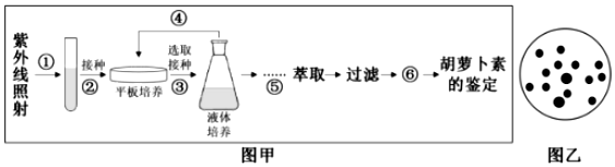 利用紫外线诱变选育高产β-胡萝卜素的三孢布拉霉负菌,未突变菌不能在含有一定浓度的β-紫罗酮的培养基上生长,菌体随β-胡萝卜素含量的增加从黄色加深至橙红色。图甲为选育菌株及提取、获得β-胡萝卜素的流程,请回答下列问题: