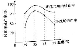 制备环戊烯的最佳温度为 35℃35℃,35~55℃之间,环戊烯的产率比环戊二烯的转化率随温度升高而减小得更快的原因是 35~55℃之间,环戊二烯的选择性下降,生成环戊烷的比例增大35~55℃之间,环戊二烯的选择性下降,生成环戊烷的比例增大。