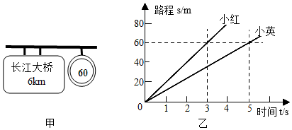 2.小英和小红两家一起自驾游,在路边上看到如图甲所示的交通标志牌,标志牌上的数字“60”表示的意思是 ,汽车在遵守交通规则的前提下,从此标志牌处到达长江大桥,最快需要 min。两辆汽车的路程s随时间t变化的图象如图乙所示。从图象可知,在时间相同时,小英和小红的路程之比是 。