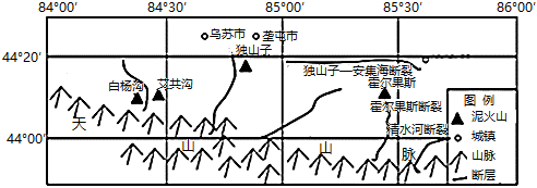 1.“泥火山”指泥浆和气体同时喷出地面堆积而成的锥形丘或盆穴丘,丘的尖部常有凹陷,并由此间断地喷出泥浆与气体。在新疆北天山分布着众多“泥火山”,喷发出的黏稠泥浆温度比当地气温低,略带汽油味,不时爆裂出几个气泡。如图为新疆北天山“泥火山”分布图,完成下面小题。