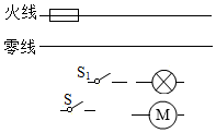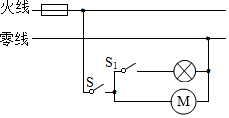 如图,家庭电路中额定电压均为220V的电风扇M和电灯,在只闭合开关S,风扇工作;只闭合开关S