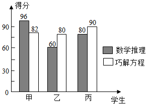 某校举办七年级数学素养大赛,比赛共设三个项目:速算比赛、数学推理、巧解方程,每个项目得分都按一定百分比折算后计入总分.甲、乙、丙三位同学的速算比赛得分均为85分,且此项在总分中所占百分比不变,其余两项得分如图所示(单位:分).