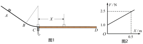 某同学利用如图1所示的装置来测量物块与木板CD间的动摩擦因数。轨道ABC的BC段为圆形轨道,C点为轨道的最低点,此处安装的压力传感能测出物块经过C点时对轨道的压力。木板CD水平放置且与BC平滑连接。将物块从轨道的某点释放后,读出物块经过C点时传感器的示数为F,测量物块停止运动后离C点的距离为X。