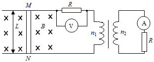 如图所示,变压器原、副线圈的匝数分别为n1=200、n2=100,原线圈与水平放置的间距L=1m的光滑金属导轨相连,导轨处于竖直向下、磁感应强度大小为B=1T的匀强磁场中,副线圈接阻值R=10Ω的电阻,原线圈串联一阻值也为R的电阻,与导轨接触良好且始终垂直,导轨的阻值r=5Ω、质量m=0.01kg的导体棒在外力F的作用下运动,其速度随时间变化的关系式为v=112sin10πt m/s,已知导轨电阻和变压器的能量损耗均不计,导轨足够长,导体棒运动过程中不会与其他用电器相碰,电表均为理想电表,则( )