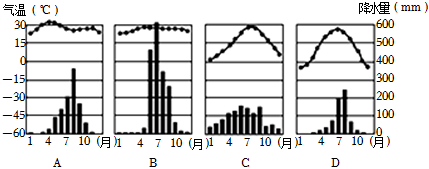 【答案】渤;西部;东南;北;中;温带季风;高温多雨;寒冷干燥;D