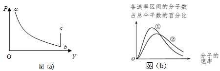 如图P-V图象中,一定质量的理想气体从状态a经等温变化到状态b,再经等容变化到状态c。从a→b的过程中,单位体积内的气体分子数目减小减小(选填“增大”、“减小”或“不变”)。状态b和状态c的气体分子热运动速率的统计分布图象如图(b),则状态c对应的是②②(选填“①”或“②”)。