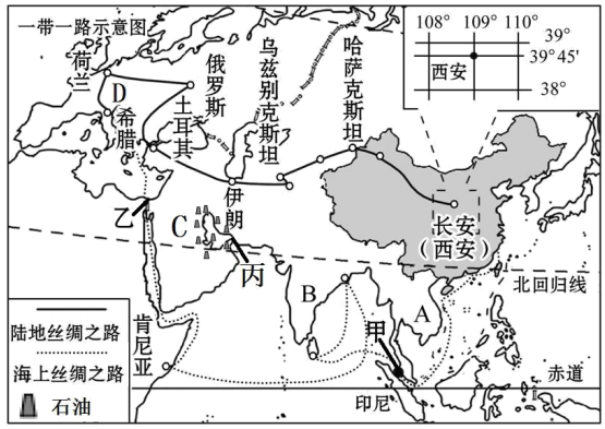 为推动区域经济一体化发展,我国提出了“一带一路”的国家发展倡议。“一带一路”是“丝绸之路经济带”和“21世纪海上丝绸之路”的简称。如图是“一带一路”示意图,请回答下列问题。