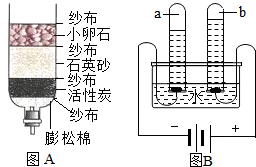1.(1)向盛有水的烧杯中加入少量品红,静置一段时间后,溶液逐渐变成红色,此实验主要说明分子的性质是.将所得溶液通过如图A的简易净水器处理后,可得到无色溶液,由此说明活性炭可以吸附物质.