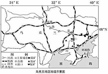 【答案】乌克兰从其所处的大陆位置来看,位于欧洲中部;根据纬度可知,乌克兰位于44°N~52°N之间,地处北温带地区;从海陆位置看,乌克兰南临黑海和亚速海;第聂伯河大致自西北向东南(先自西北向东南,后向西南流入黑海);流域地势较平坦;流程长;径流量较大;结冰期较短;河流含沙量较低;沿途地区人口集中,工业发达,货运量大;过度开垦土地,导致地表植被破坏严重,加剧风力侵蚀作用;冶金、机械、电力、化学等重工业发达;煤炭、水电等能源充足;铁、锰等矿产资源丰富;铁路、港口提供便利的交通运输条件;邻近欧洲经济发达地区,市场广大
