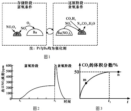 (3)某实验小组模拟NSR系统中的一个存储、还原过程,让尾气通过NSR反应器,测得过程中出口NO2浓度变化如图2。t2时刻,切换至贫氧条件,NO2的浓度急剧上升又快速下降的原因为:从Ba(NO3)2中释放NO2,NO2的浓度浓度急剧上,然后在Pt的表面被CO、H2还原为N2,NO2的浓度又快速下降从Ba(NO3)2中释放NO2,NO2的浓度浓度急剧上,然后在Pt的表面被CO、H2还原为N2,NO2的浓度又快速下降。