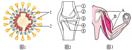 (3)运动员在运动训练时,图2中的[②]关节囊关节囊保证了关节的牢固性,[⑤⑤]关节软骨可在两骨间起减少摩擦和缓冲作用,但若运动中遭到外来冲击,也可能使[①①]关节头从[④]关节窝中滑出,造成脱臼。