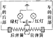 某仪器的电路如图所示,其中带金属细杆的金属滑块M与两侧金属弹簧相连接并接入电路中,金属块M与弹簧套在光滑绝缘水平细杆上。现将该仪器固定在一辆汽车上,当汽车启动时,绿灯绿灯(红灯/绿灯)亮;当汽车急刹车时,红灯红灯(红灯/绿灯)亮。