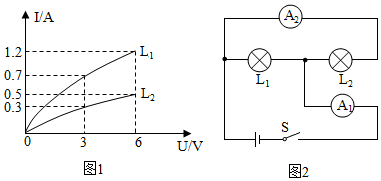 1.灯泡L1与L2的额定电压均为6V,如图1是两灯的电流随其两端电压变化的曲线。现将两灯接入如图2所示电路,电源电压为3V,闭合开关,两灯泡均发光,则此时电流表A1示数与L2阻值分别是( )