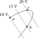 如图所示的虚线为电场中的三条等势线,三条虚线平行且等间距,电势分别为10V、15V、20V,实线是仅受电场力的带电粒子的运动轨迹,a、b、c是轨迹上的三个点,粒子在c点处的电势能为20eV,粒子在b点的动能为20eV,下列说法正确的是( )