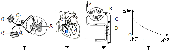 (3)血液中的酒精随血液循环在身体内流动,最先进入乙图心脏中的[ⅠⅠ]右心房右心房。当血液流经肾脏时,丁图所示为 葡萄糖葡萄糖浓度变化曲线图,这个变化发生在丙图中的部位[DD]肾小管肾小管。此处,除了发生上述变化外,毛细血管和细胞之间还发生了物质交换,使血液的成分发生了变化,与A相比较,血液成分中的 尿素、氧气尿素、氧气明显减少了(至少要写出主要的两种)。