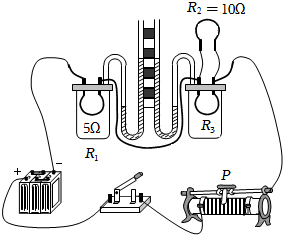 如图所示,研究电流产生的热量与电流大小的关系,将R1接入电路,再将R2、R3并联接入电路,为了完成实验,R3应选用阻值为 55Ω的电热丝。闭合开关,观察到U形管内液面高度变化较慢,不改变实验器材,为缩短观察时间,接下来的操作是 向左移动变阻器的滑片P向左移动变阻器的滑片P。通电一段时间,R1产生的热量是Q,R3产生热量是Q',则Q 大于大于Q'(选填“大于”、“等于”或“小于”)。