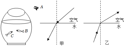 1.如图鱼缸中有一条小鱼,而眼睛从A点可以观察到两条“鱼”,位置如图中所示B、C。能反映出B点“鱼”的成像光路是 (选填“甲”或“乙”),此时为 像,(选填“实”或“虚”),位置比真实鱼的位置要偏 (选填“高”或“低”);C点看到的“鱼”比真实鱼大,是因为水和玻璃鱼缸的共同作用相当于 。