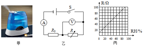 1.图甲所示为一个超声波加湿器,图乙为其内部湿度监测装置的简化电路图。已知电源电压为12V,定值电阻R0的阻值为30Ω,电流表的量程为0~200mA,电压表的量程为0~9V。湿敏电阻R的阻值随湿度RH变化的关系图象如图丙所示,其阻值最大为120Ω(图中未画出)。