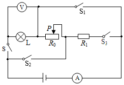如图所示,电源电压和灯泡电阻不变,灯L标有“2.5V 1.25W”字样,定值电阻R1,滑动变阻器R0标有“?Ω 1A”字样,电流表量程为0~3A。当闭合开关S、S3,断开S1、S2,滑动变阻器滑片P在最右端时,R1的功率为P1,当滑动变阻器滑片P移动到某一位置时,R0连入的电阻减小了9Ω,灯泡恰好正常发光,R1的功率为P2,P1:P2=16:25,滑动变阻器最大阻值是R1的3倍。求: