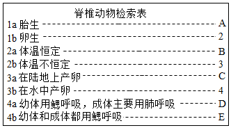 (1)蛙属于脊椎动物中的两栖类。如图是脊椎动物检索表。“两栖类”在检索表中对应的是 DD(选填“A”“B““C”“D”或“E”)。