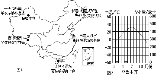 (3)乌鲁木齐“一天过两季,单衣不够外套凑”的穿衣指南让人困惑。通过查阅资料,了解了该地的气温曲线和降水量柱状图,如右图所示。原来,该地的气候类型为 温带大陆性温带大陆性气候,夏热冬冷,全年 少雨少雨(少雨/多雨/湿润),气温年较差、日较差均 较大较大(较大/较小)。