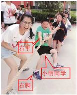 如图为在班级拔河对抗赛中小明同学所在班级的比赛现场,对此时小明的受力,下列说法正确的是( )