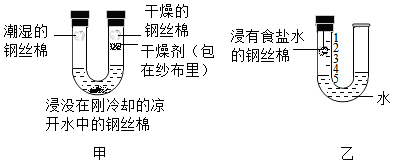 (1)借助U型玻璃管探究钢铁锈蚀的条件,如图甲所示。一段时间后观察到潮湿的钢丝棉有明显锈迹,浸没在刚冷却的凉开水中的钢丝棉没有锈迹,此现象说明 铁的锈蚀与氧气有关铁的锈蚀与氧气有关。
