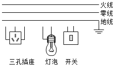 请用笔画线代替导线,将图中的开关、灯泡和三孔插座正确接入家庭电路中。