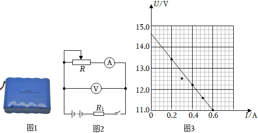 (3)闭合电键,调节滑动变阻器R,测出多组数据,作出电压与电流的关系图线如图3所示。根据图线可得该电源的电动势E=14.614.6V,内阻r=2.02.0Ω。(结果均保留一位小数)