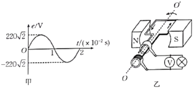 一台小型发电机产生的电动势随时间变化的正弦规律图像如图甲所示。已知发电机线圈内阻为10Ω,目前外接一只电阻为100Ω的灯泡,如图乙所示,则( )