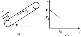 如图甲所示,倾角为θ=30°的传送带以v2=10m/s的速度顺时针转动,传送带装置的底部到顶部之间的距离为L=16.25m。一物块以某一速度v1冲上传送带的底端,经过时间t0物块正好到达传送带的顶端,物块与传送带间的动摩擦因数μ=32,物块质量m=1kg,物块和传送带的v-t图像如图乙所示,重力加速度g=10m/s2,下列说法正确( )