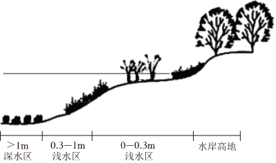 为保护鸟类的多样性,某地依据右侧示意图将荒地改建为湿地公园,以作为鸟类的栖息地。计划从草本植物、低矮灌木和高大乔木中选择适宜植物种植在水岸高地。下列说法错误的是( )