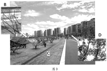 (3)写出图3中字母对应植物所属的植被类型:B 落叶阔叶林落叶阔叶林;C 草地草地;D 亚热带常绿阔叶林亚热带常绿阔叶林。这种多树木混种,乔灌草结合的绿化方法,不但使景观变得多姿,也有利于的 生态环境生态环境稳定。