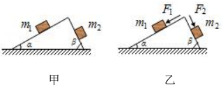 如图甲所示,在粗糙水平面上静止放置一个截面为三角形的斜劈,其质量为M。两个质量分别为m1和m2的小物块恰好能沿两侧面匀速下滑。若现在对两物块同时各施加一个平行于斜劈侧面的恒力F1、F2,且F1>F2,如图所示。则在两个小物块沿斜面下滑的过程中,下列说法正确的是( )
