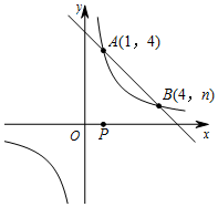 如图,一次函数y=kx+b与反比例函数y=mx的图象交于A(1,4),B(4,n)两点.