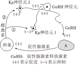 Kisspeptin,简称Kp,是Kp神经元产生的一类多肽类激素,它通过调节生物体内雌激素含量来调控生殖活动。通常情况下,如图中的过程①参与鹌鹑体内雌激素含量的调节;排卵前期,启动过程②进行调节,字母A代表参与调节的器官。下列说法正确的是( )