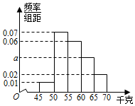 为了解学生的身体状况,某校随机抽取了一批学生测量体重.经统计,这批学生的体重数据(单位:千克)全部介于45至70之间.将数据分成5组,并得到如图所示的频率分布直方图.图中a的值为( )